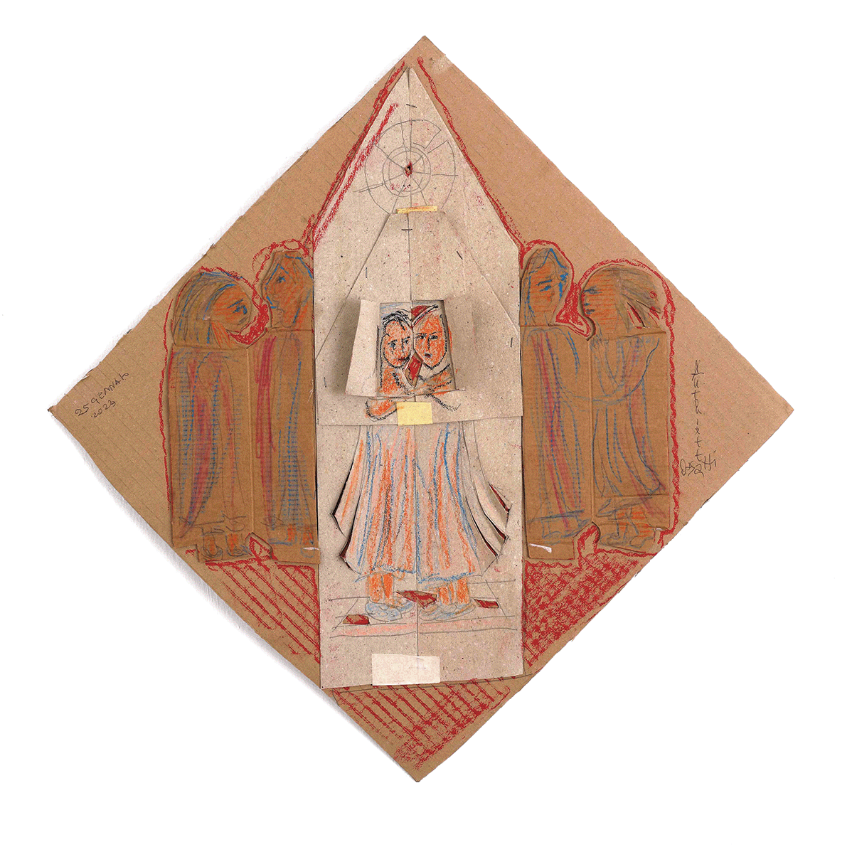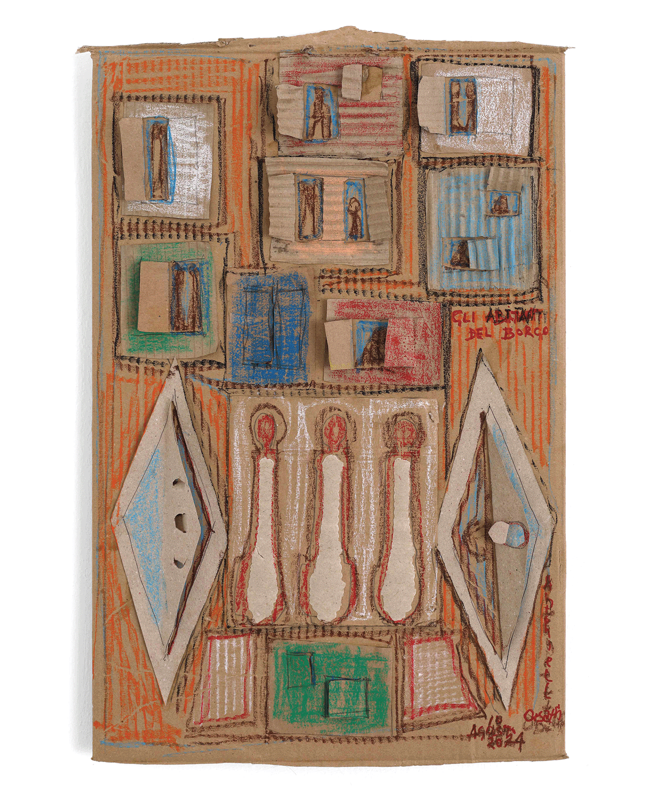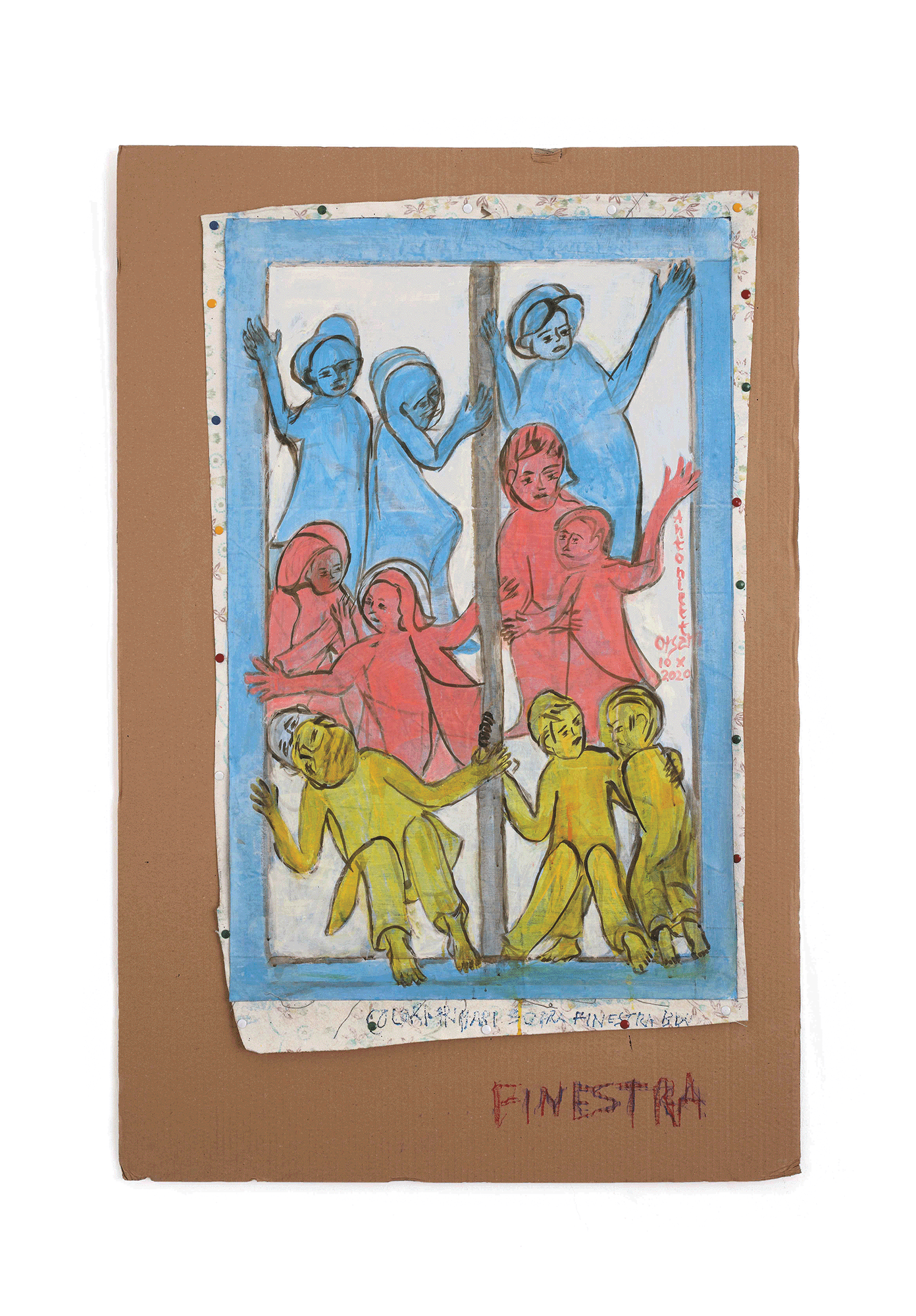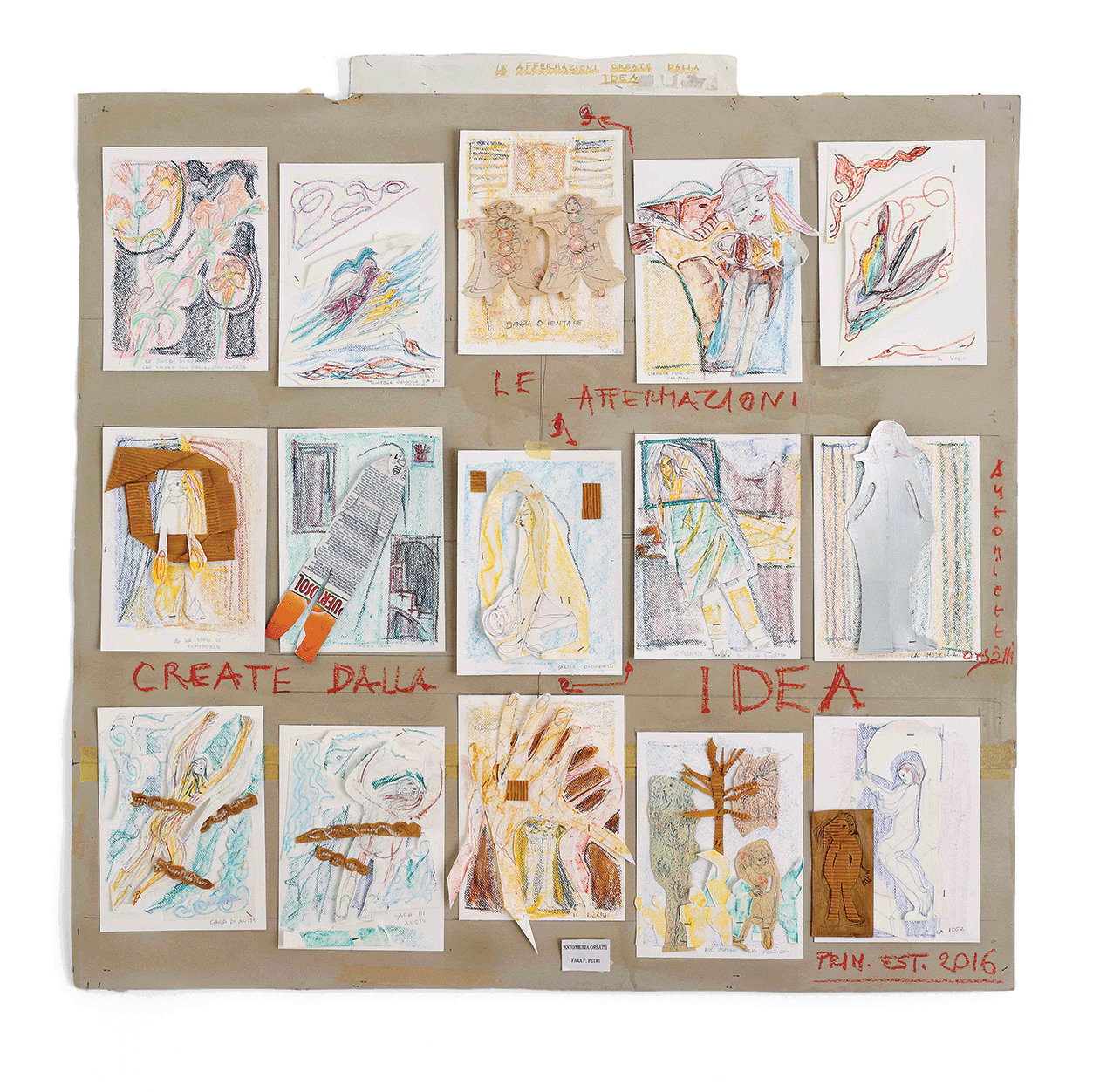 Una creatività inesausta è quella luce interna che ha portato Antonietta a lottare per la propria emancipazione, imponendo il proprio percorso di studi contro il volere dei genitori, mantenendosi durante gli anni di studio con diversi lavori per poi sposarsi, mettere al mondo quattro figli (fra questi lo storico dell’arte Andrea Iezzi) e abbracciare l’insegnamento del disegno nelle scuole. Il suo lavoro scultoreo si volge allora dalla pietra della Majella, che scolpisce a mano con mazzetta e scalpello, alla modellazione dei “foratini”, i mattoni forati da costruzione prodotti nella fornace industriale di proprietà del marito, materiale che lavora ancora fresco per poi cuocerlo nella fornace. Antonietta sperimenta e utilizza diverse tecniche, dal collage alla linoleografia, dipinge su lenzuoli grandi come pareti e passa infine, nella sua piena maturità, all’ “età del cartone” (la definizione è, credo, sempre di Accatino), dove ogni retaggio accademico è ormai eliminato e la sua voce squilla limpida nel suo timbro originale, dando forma senza remore alle fantasie del proprio sé.
