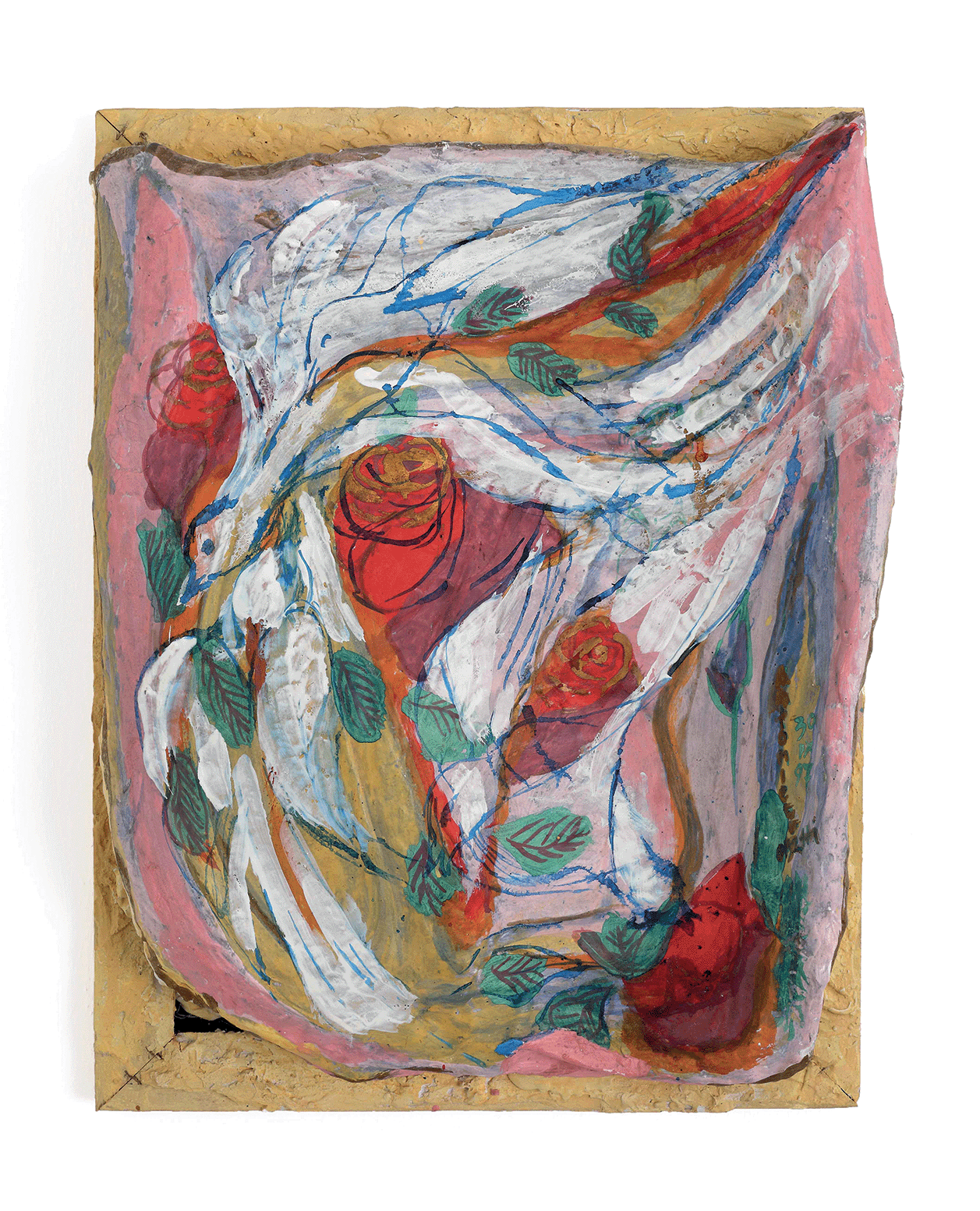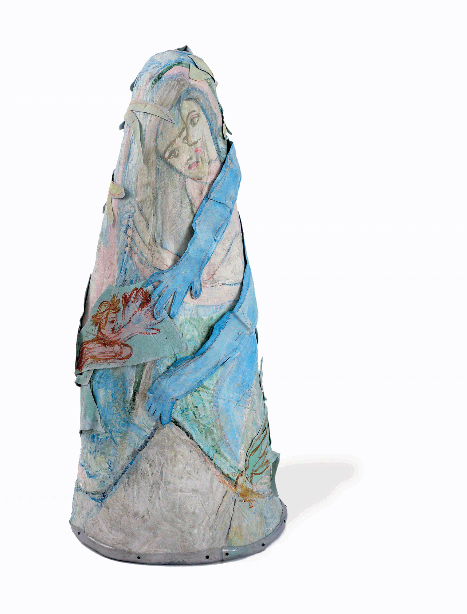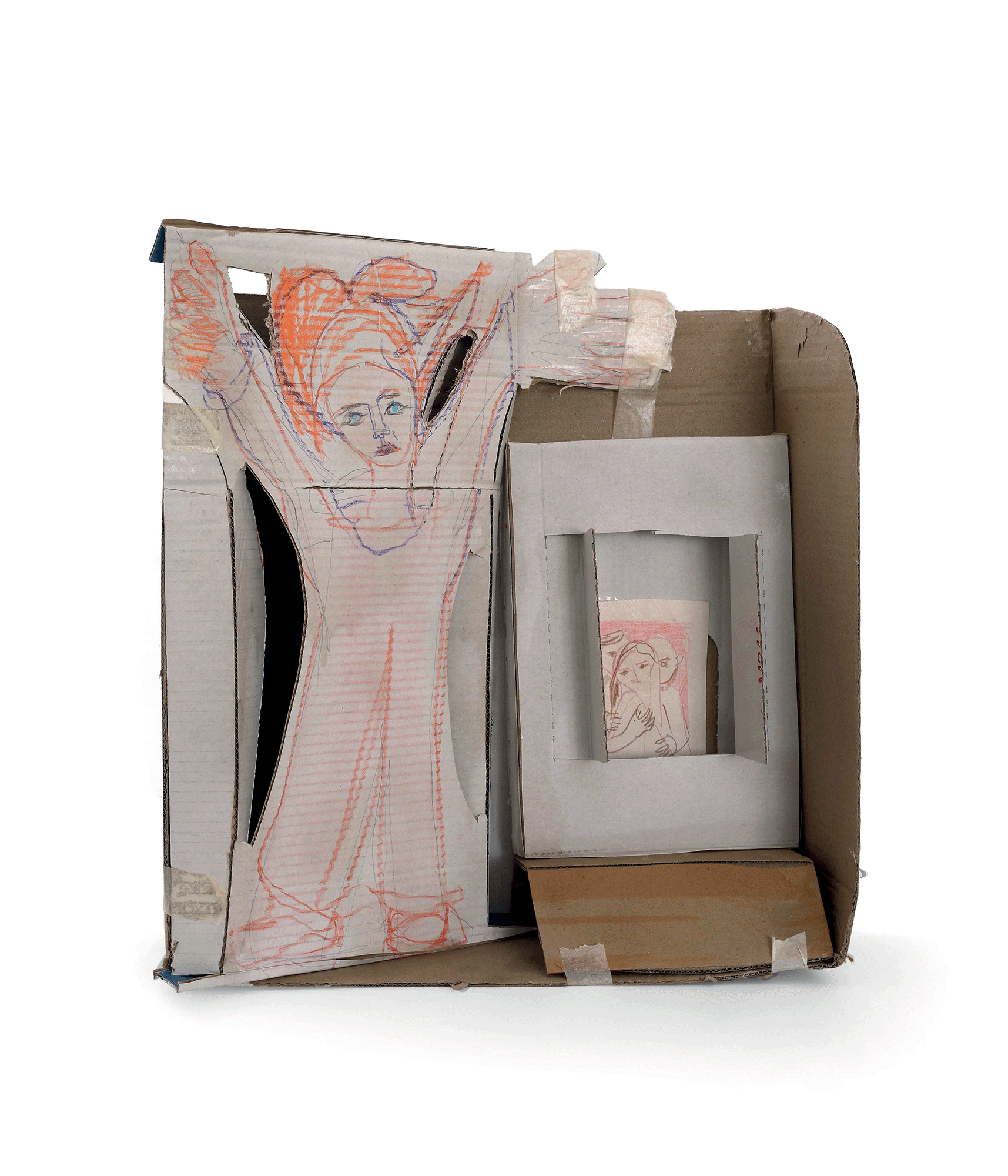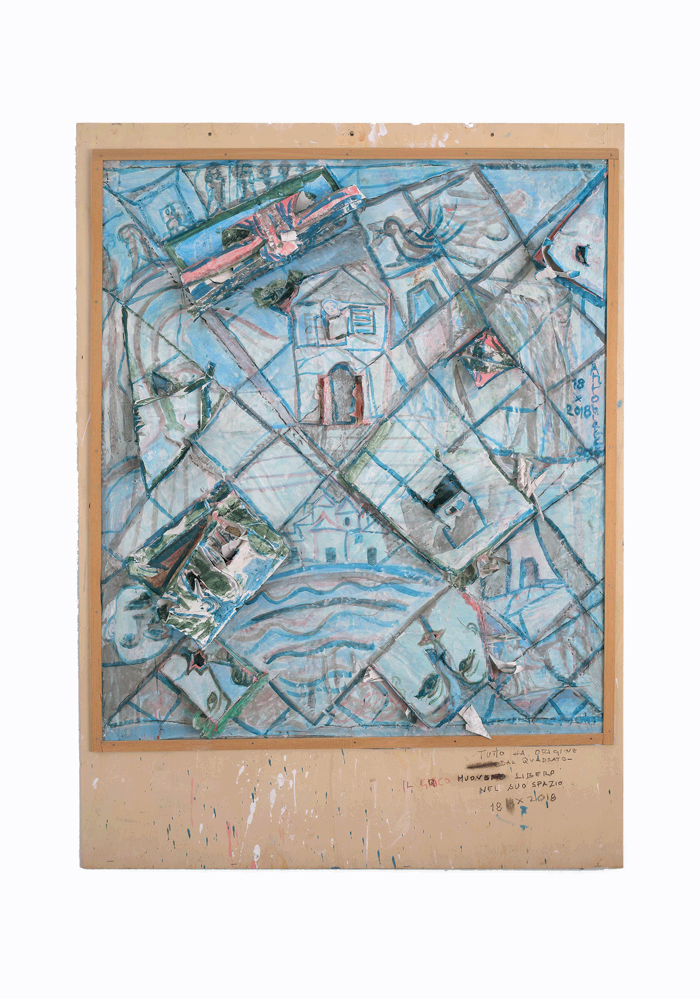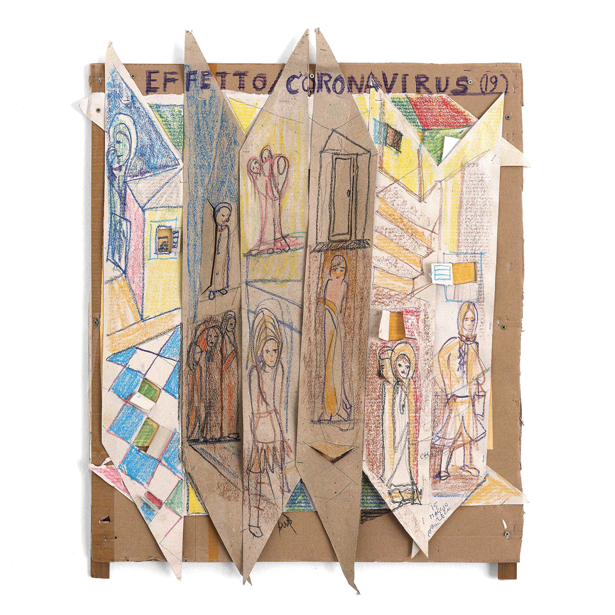 Una creatività inesausta è quella luce interna che ha portato Antonietta a lottare per la propria emancipazione, imponendo il proprio percorso di studi contro il volere dei genitori, mantenendosi durante gli anni di studio con diversi lavori per poi sposarsi, mettere al mondo quattro figli (fra questi lo storico dell’arte Andrea Iezzi) e abbracciare l’insegnamento del disegno nelle scuole. Il suo lavoro scultoreo si volge allora dalla pietra della Majella, che scolpisce a mano con mazzetta e scalpello, alla modellazione dei “foratini”, i mattoni forati da costruzione prodotti nella fornace industriale di proprietà del marito, materiale che lavora ancora fresco per poi cuocerlo nella fornace. Antonietta sperimenta e utilizza diverse tecniche, dal collage alla linoleografia, dipinge su lenzuoli grandi come pareti e passa infine, nella sua piena maturità, all’ “età del cartone” (la definizione è, credo, sempre di Accatino), dove ogni retaggio accademico è ormai eliminato e la sua voce squilla limpida nel suo timbro originale, dando forma senza remore alle fantasie del proprio sé.